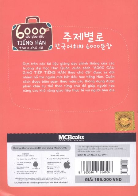 Cuốn sách 6000 câu giao tiếp tiếng Hàn theo chủ đề được thiết kế với nội dung hết sức thiết thực từ cơ bản nhất như cách chào hỏi, xưng hô,… đến những tình huống giao tiếp trong ngữ cảnh cụ thể cách bày tỏ ý kiến, thời tiết, ngân hàng,… Đây là những kiến thức nền tảng phục vụ nhu cầu học sâu hơn về sau.Cuốn sách phù hợp với học sinh, sinh viên , người đi làm, giáo viên sử dụng ngôn ngữ tiếng Hàn