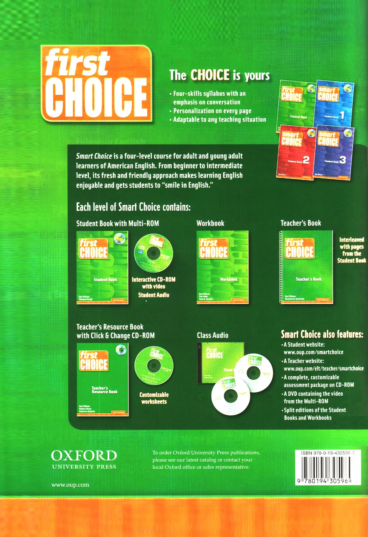 First Choice work book is a complete four-skills course with a special focus on conversation. With its straightforward approach, the series requires minimal preparation, while allowing plenty of opportunity for supplementation. Each page of Smart Choice offers a self-contained lesson, focusing on a particular skill, and closes with a discussion activity. A balance of work on speaking, listening, reading, writing, grammar, vocabulary, and pronunciation ensures a high level of student engagement, as well as mutual reinforcement of the language skills.