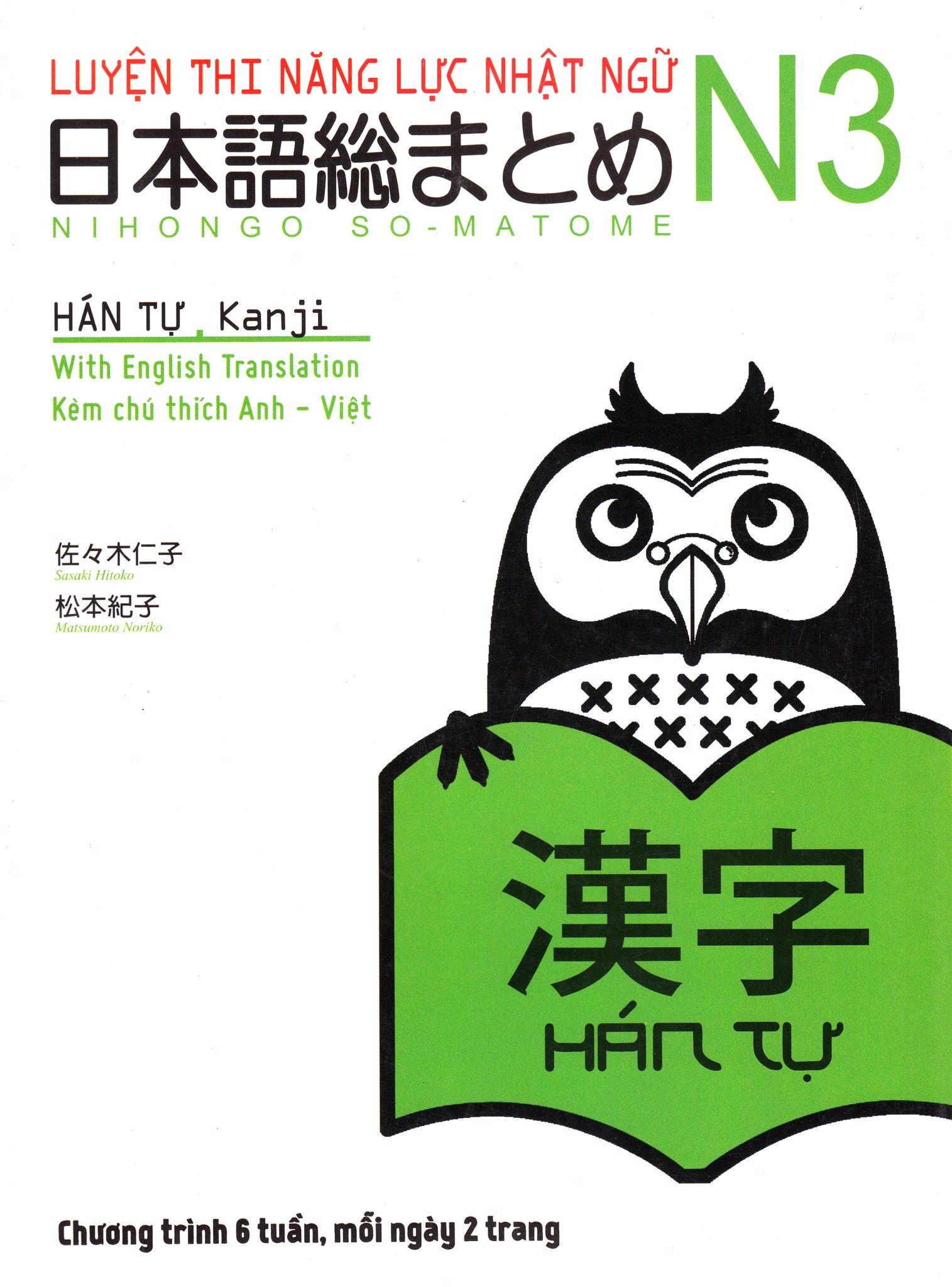 Sách luyện thi N3 Somatome hán tự bản tiếng Việt giúp người học nắm vững những hán tự và những từ được viết bằng Hán tự thường thấy ở những bảng biểu hay những văn bản. Mỗi ngày học 6,7 chữ thì tổng cộng người học sẽ học được 336 chữ và khoảng 850 từ trong vòng 6 tuần lễ.
