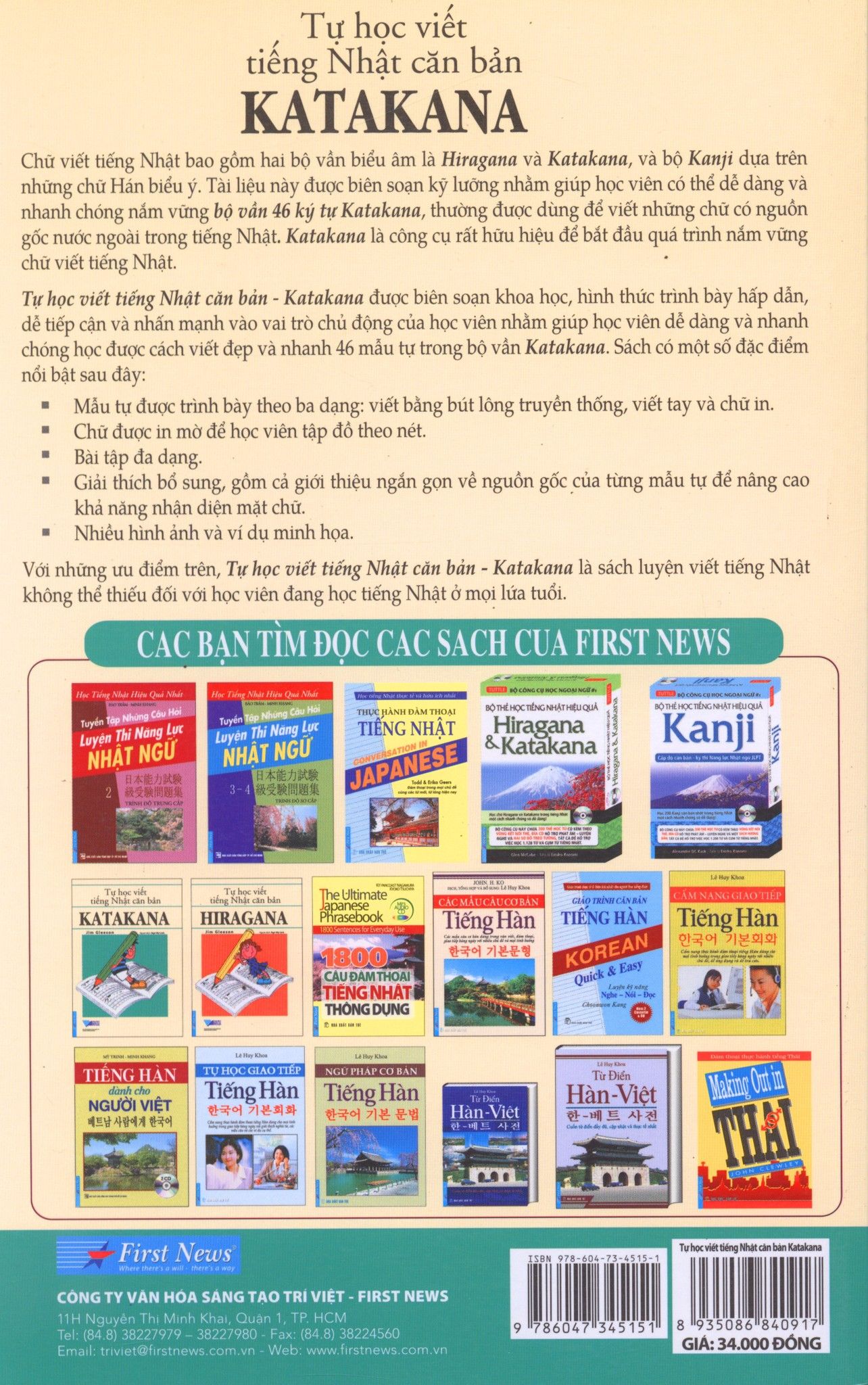 Bộ sách Tự học viết tiếng Nhật căn bản (Hiragana & Katakana) được biên soạn khoa học, hình thức trình bày hấp dẫn, dễ tiếp cận và nhấn mạnh vào vai trò chủ động của học viên nhắm giúp học viên dễ dàng học cách viết đẹp và nhanh 46 mẫu tự trong hai bộ vần Hiragana và Katakana.